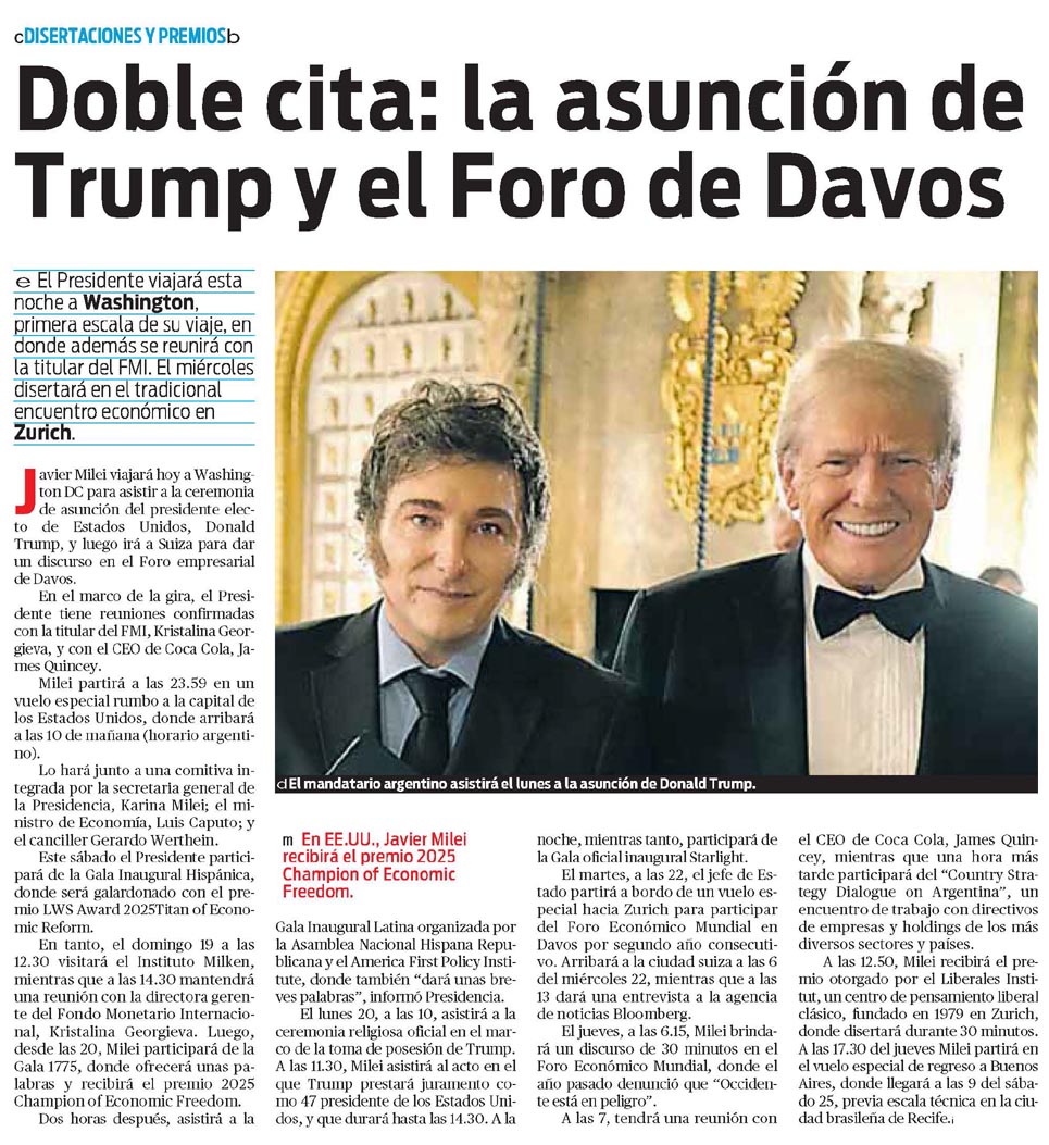 Javier Milei viajará hoy a Washington DC para asistir a la ceremonia de asunción del presidente electo de Estados Unidos, Donald Trump, y luego irá a Suiza para dar un discurso en el Foro empresarial de Davos. En el marco de la gira, el Presidente tiene reuniones confirmadas con la titular del FMI, Kristalina Georgieva, y con el CEO de Coca Cola, James Quincey. Milei partirá a las 23.59 en un vuelo especial rumbo a la capital de los Estados Unidos, donde arribará a las 10 de mañana (horario argentino). Lo hará junto a una comitiva integrada por la secretaria general de la Presidencia, Karina Milei; el ministro de Economía, Luis Caputo; y el canciller Gerardo Werthein. Este sábado el Presidente participará de la Gala Inaugural Hispánica, donde será galardonado con el premio LWS Award 2025Titan of Economic Reform. En tanto, el domingo 19 a las 12.30 visitará el Instituto Milken, mientras que a las 14.30 mantendrá una reunión con la directora gerente del Fondo Monetario Internacional, Kristalina Georgieva. Luego, desde las 20, Milei participará de la Gala 1775, donde ofrecerá unas palabras y recibirá el premio 2025 Champion of Economic Freedom. Dos horas después, asistirá a la Gala Inaugural Latina organizada por la Asamblea Nacional Hispana Republicana y el America First Policy Institute, donde también "dará unas breves palabras", informó Presidencia. El lunes 20, a las 10, asistirá a la ceremonia religiosa oficial en el marco de la toma de posesión de Trump. A las 11.30, Milei asistirá al acto en el que Trump prestará juramento como 47 presidente de los Estados Unidos, y que durará hasta las 14.30. A la noche, mientras tanto, participará de la Gala oficial inaugural Starlight. El martes, a las 22, el jefe de Estado partirá a bordo de un vuelo especial hacia Zurich para participar del Foro Económico Mundial en Davos por segundo año consecutivo. Arribará a la ciudad suiza a las 6 del miércoles 22, mientras que a las 13 dará una entrevista a la agencia de noticias Bloomberg. El jueves, a las 6.15, Milei brindará un discurso de 30 minutos en el Foro Económico Mundial, donde el año pasado denunció que "Occidente está en peligro". A las 7, tendrá una reunión con el CEO de Coca Cola, James Quincey, mientras que una hora más tarde participará del "Country Strategy Dialogue on Argentina", un encuentro de trabajo con directivos de empresas y holdings de los más diversos sectores y países. A las 12.50, Milei recibirá el premio otorgado por el Liberales Institut, un centro de pensamiento liberal clásico, fundado en 1979 en Zurich, donde disertará durante 30 minutos. A las 17.30 del jueves Milei partirá en el vuelo especial de regreso a Buenos Aires, donde llegará a las 9 del sábado 25, previa escala técnica en la ciudad brasileña de Recife.
